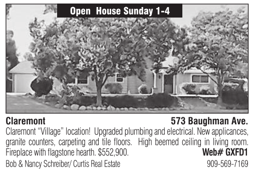 Open House Sunday 1-4 Claremont 573 Baughman Ave. Claremont “Village” location! Upgraded plumbing and electrical. New applicances, granite counters, carpeting and tile floors. High beemed ceiling in living room. Fireplace with flagstone hearth. $552,900. Web# GXFD1 Bob & Nancy Schreiber/ Curtis Real Estate 909-569-7169