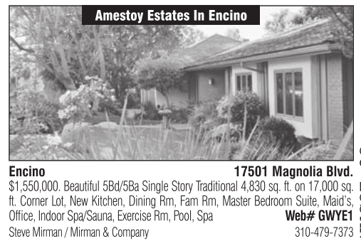 Amestoy Estates In Encino Encino 17501 Magnolia Blvd. $1,550,000. Beautiful 5Bd/5Ba Single Story Traditional 4,830 sq. ft. on 17,000 sq. ft. Corner Lot, New Kitchen, Dining Rm, Fam Rm, Master Bedroom Suite, Maid’s, Office, Indoor Spa/Sauna, Exercise Rm, Pool, Spa Web# GWYE1 Steve Mirman / Mirman & Company 310-479-7373