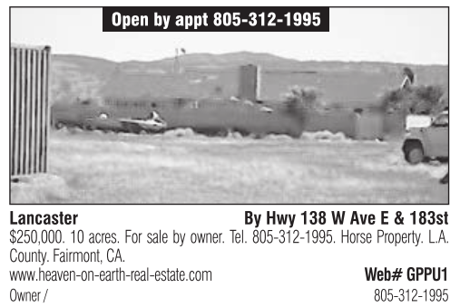 Lancaster By Hwy 138 W Ave E & 183st $250,000. 10 acres. For sale by owner. Tel. 805-312-1995. Horse Property. L.A. County. Fairmont, CA. www.heaven-on-earth-real-estate.com