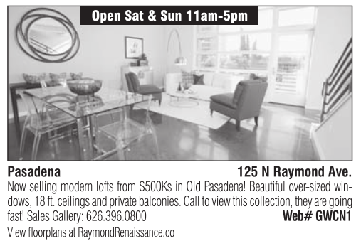 Open Sat & Sun 11am-5pm View floorplans at RaymondRenaissance.co Pasadena 125 N Raymond Ave. Now selling modern lofts from $500Ks in Old Pasadena! Beautiful over-sized windows, 18 ft. ceilings and private balconies. Call to view this collection, they are going fast! Sales Gallery: 626.396.0800 Web# GWCN1