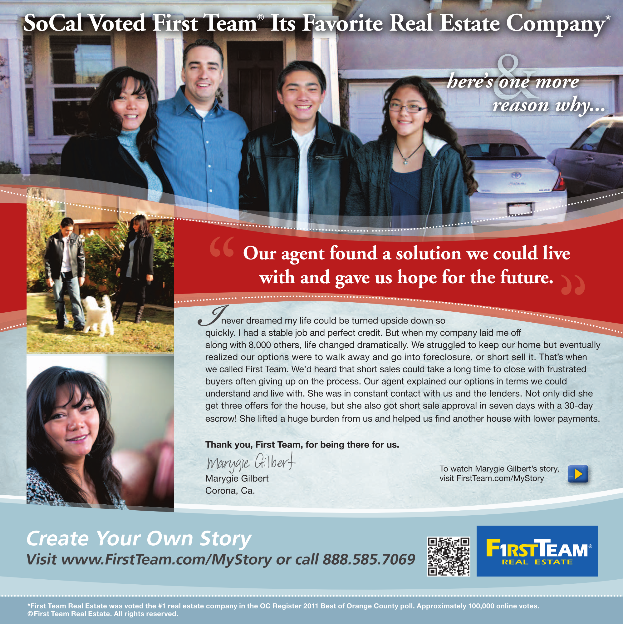 SoCal Voted First Team ® Its Favorite Real Estate Company* here’s one more reason why... Our agent found a solution we could live with and gave us hope for the future. I never dreamed my life could be turned upside down so quickly. I had a stable job and perfect credit. But when my company laid me off along with 8,000 others, life changed dramatically. We struggled to keep our home but eventually realized our options were to walk away and go into foreclosure, or short sell it. That’s when we called First Team. We’d heard that short sales could take a long time to close with frustrated buyers often giving up on the process. Our agent explained our options in terms we could understand and live with. She was in constant contact with us and the lenders. Not only did she get three offers for the house, but she also got short sale approval in seven days with a 30-day escrow! She lifted a huge burden from us and helped us find another house with lower payments. Thank you, First Team, for being there for us. Marygie Gilbert Corona, Ca. To watch Marygie Gilbert’s story, visit FirstTeam.com/MyStory Create Your Own Story Visit www.FirstTeam.com/MyStory or call 888.585.7069 *First Team Real Estate was voted the #1 real estate company in the OC Register 2011 Best of Orange County poll. Approximately 100,000 online votes. © First Team Real Estate. All rights reserved.