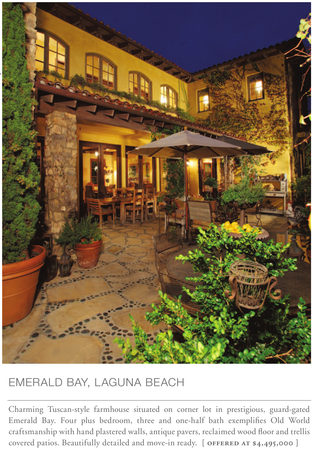 Charming Tuscan-style farmhouse situated on corner lot in prestigious, guard-gated Emerald Bay. Four plus bedroom, three and one-half bath exemplifies Old World craftsmanship with hand plastered walls, antique pavers, reclaimed wood floor and trellis covered patios. Beautifully detailed and move-in ready. [ offered at $4,495,000 ]