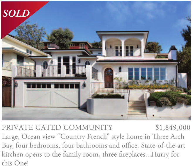 PRIVATE GATED COMMUNITY $1,849,000 Large, Ocean view “Country French” style home in Three Arch Bay, four bedrooms, four bathrooms and office. State-of-the-art kitchen opens to the family room, three fireplaces...Hurry for this One!