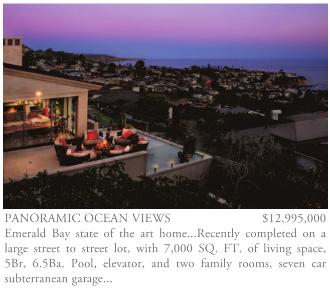 PANORAMIC OCEAN VIEWS $12,995,000 Emerald Bay state of the art home...Recently completed on a large street to street lot, with 7,000 SQ. FT. of living space, 5Br, 6.5Ba. Pool, elevator, and two family rooms, seven car subterranean garage...