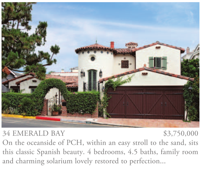 34 EMERALD BAY $3,750,000 On the oceanside of PCH, within an easy stroll to the sand, sits this classic Spanish beauty. 4 bedrooms, 4.5 baths, family room and charming solarium lovely restored to perfection...