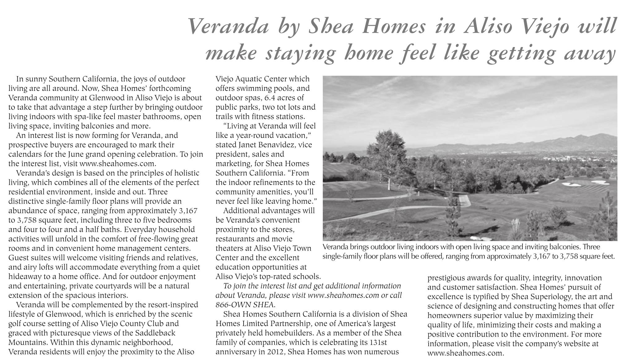 “Living at Veranda will feel like a year-round vacation,” stated Janet Benavidez, vice president, sales and marketing, for Shea Homes Southern California. “From the indoor refinements to the community amenities, you’ll never feel like leaving home.”