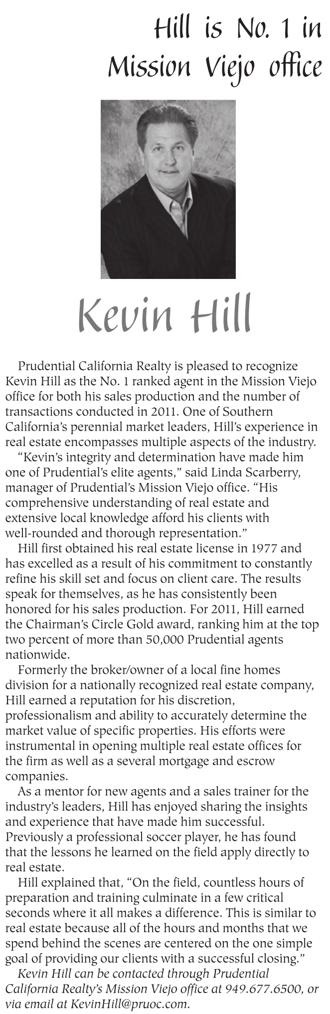 Prudential California Realty is pleased to recognize Kevin Hill as the No. 1 ranked agent in the Mission Viejo office for both his sales production and the number of transactions conducted in 2011. One of Southern California’s perennial market leaders, Hill’s experience in real estate encompasses multiple aspects of the industry.