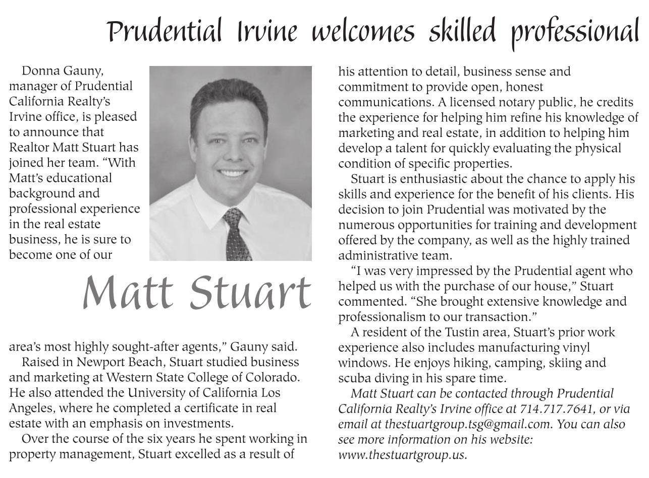 Donna Gauny, manager of Prudential California Realty’s Irvine office, is pleased to announce that Realtor Matt Stuart has joined her team. “With Matt’s educational background and professional experience in the real estate business, he is sure to become one of our