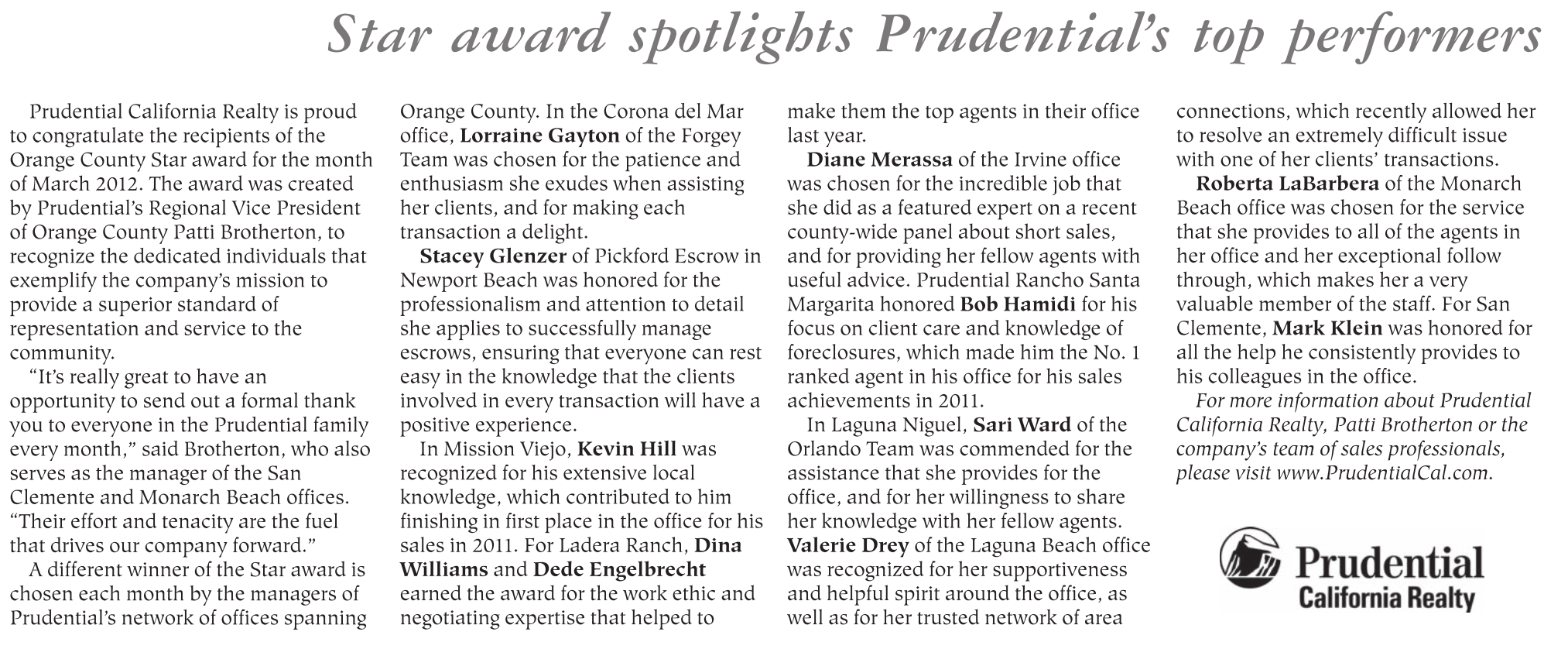 Prudential California Realty is proud to congratulate the recipients of the Orange County Star award for the month of March 2012. The award was created by Prudential’s Regional Vice President of Orange County Patti Brotherton, to recognize the dedicated individuals that exemplify the company’s mission to provide a superior standard of representation and service to the community.