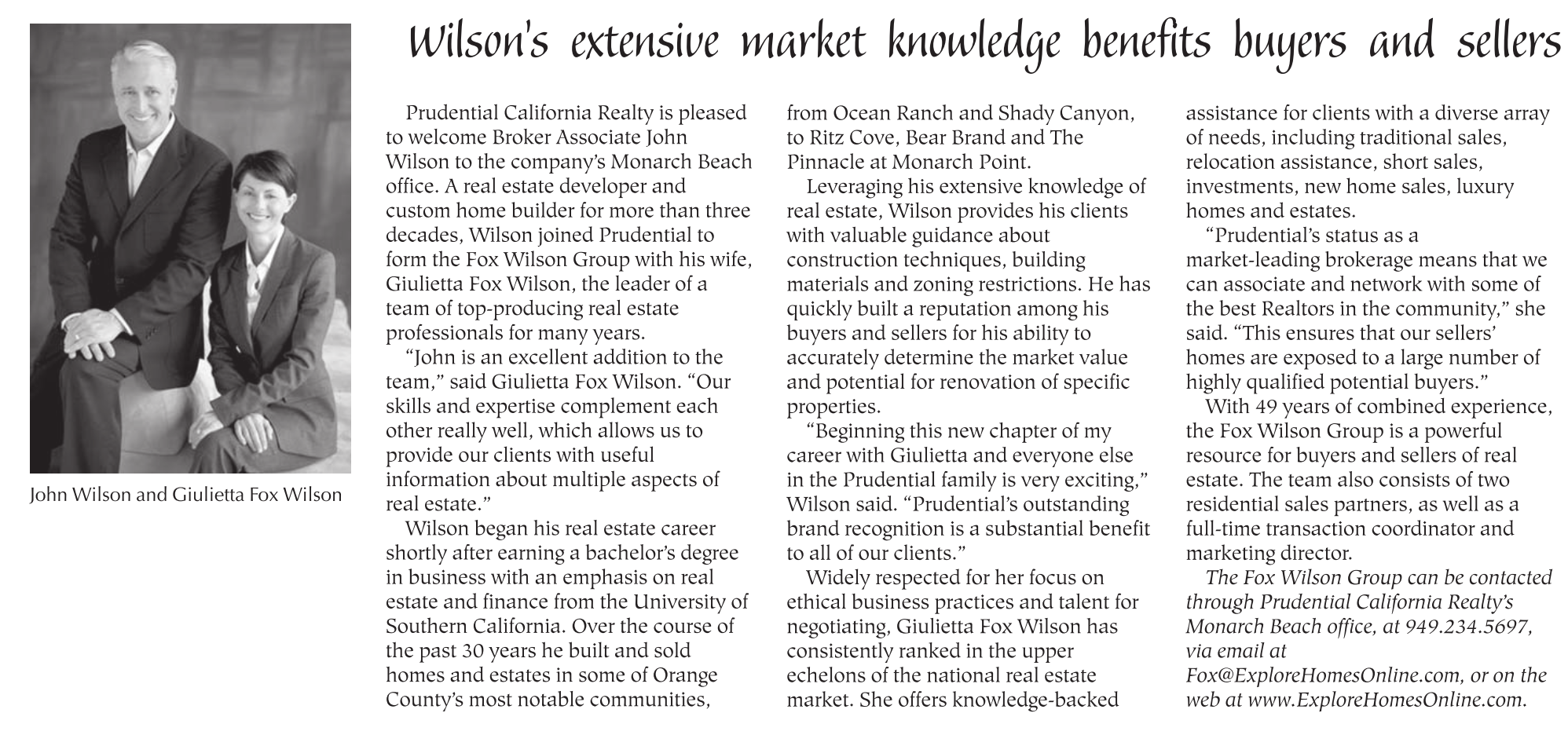 The Fox Wilson Group can be contacted through Prudential California Realty’s Monarch Beach office, at 949.234.5697, via email at Fox@ExploreHomesOnline.com, or on the web at www.ExploreHomesOnline.com.