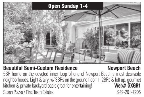 5BR home on the coveted inner loop of one of Newport Beach’s most desirable neighborhoods. Light & airy, w/ 3BRs on the ground floor + 2BRs & loft up, gourmet kitchen & private backyard oasis great for entertaining! Web# GXGB1 Susan Piazza / First Team Estates 949-201-7205