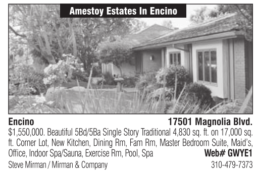 Amestoy Estates In Encino Encino 17501 Magnolia Blvd. $1,550,000. Beautiful 5Bd/5Ba Single Story Traditional 4,830 sq. ft. on 17,000 sq. ft. Corner Lot, New Kitchen, Dining Rm, Fam Rm, Master Bedroom Suite, Maid’s, Office, Indoor Spa/Sauna, Exercise Rm, Pool, Spa Web# GWYE1 Steve Mirman / Mirman & Company 310-479-7373