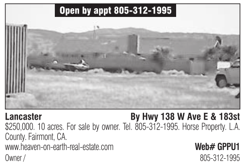 Lancaster By Hwy 138 W Ave E & 183st $250,000. 10 acres. For sale by owner. Tel. 805-312-1995. Horse Property. L.A. County. Fairmont, CA. www.heaven-on-earth-real-estate.com