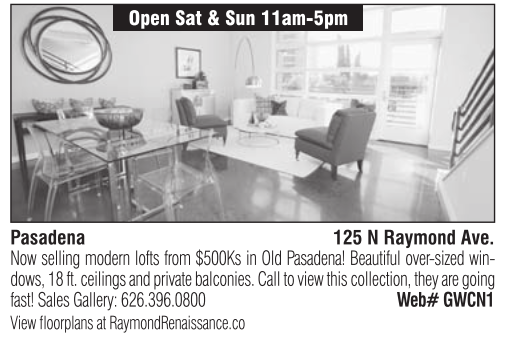Open Sat & Sun 11am-5pm Pasadena 125 N Raymond Ave. Now selling modern lofts from $500Ks in Old Pasadena! Beautiful over-sized windows, 18 ft. ceilings and private balconies. Call to view this collection, they are going fast! Sales Gallery: 626.396.0800 Web# GWCN1 View floorplans at RaymondRenaissance.co