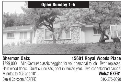 Open Sunday 1-5 Sherman Oaks 15601 Royal Woods Place $799,000. Mid-Century classic begging for your personal touch. Two fireplaces. Hard wood floors. Quiet cul du sac; pool in fenced yard. Two car detached garage. Minutes to 405 and 101. Web# GXFB1 Daniel Corcoran / CAPRE 310-275-0098