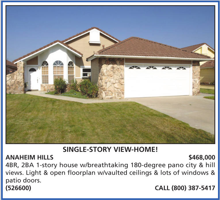 ANAHEIM HILLS $468,000 4BR, 2BA 1-story house w/breathtaking 180-degree pano city & hill views. Light & open floorplan w/vaulted ceilings & lots of windows & patio doors. (526600) CALL (800) 387-5417