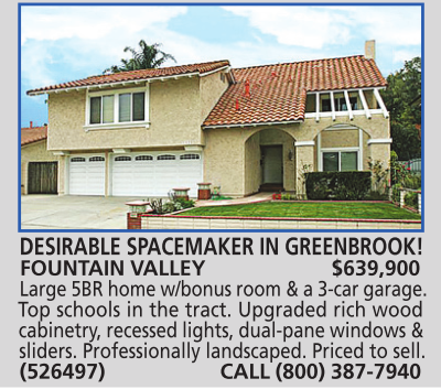 DESIRABLE SPACEMAKER IN GREENBROOK! FOUNTAIN VALLEY $639,900 Large 5BR home w/bonus room & a 3-car garage. Top schools in the tract. Upgraded rich wood cabinetry, recessed lights, dual-pane windows & sliders. Professionally landscaped. Priced to sell. (526497) CALL (800) 387-7940