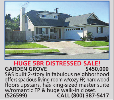 GARDEN GROVE $450,000 S&S built 2-story in fabulous neighborhood offers spacious living room w/cozy FP, hardwood floors upstairs, has king-sized master suite w/romantic FP & huge walk-in closet. (526599) CALL (800) 387-5417