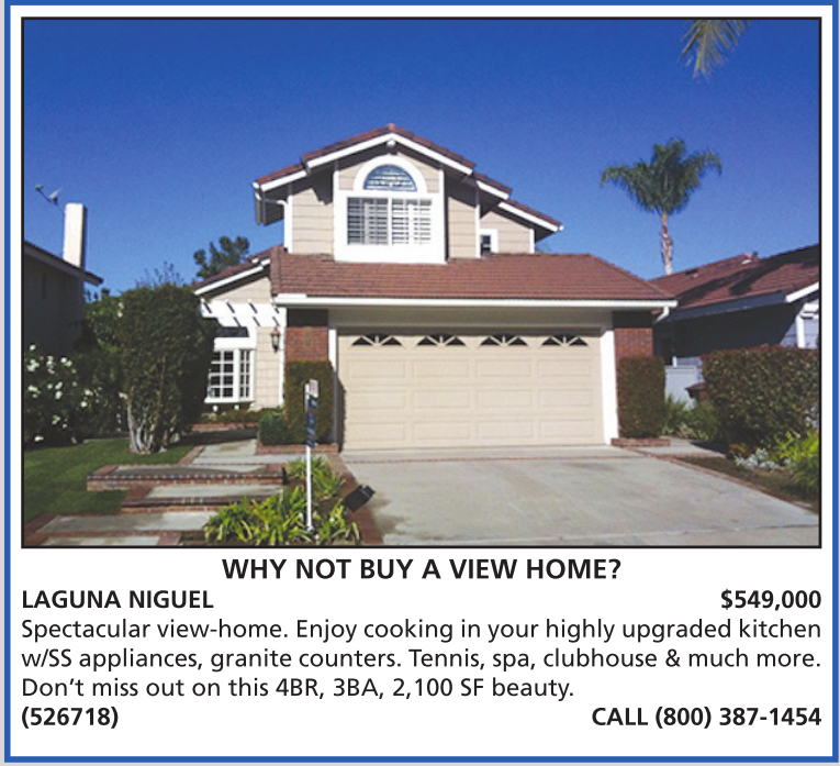 LAGUNA NIGUEL $549,000 Spectacular view-home. Enjoy cooking in your highly upgraded kitchen w/SS appliances, granite counters. Tennis, spa, clubhouse & much more. Don’t miss out on this 4BR, 3BA, 2,100 SF beauty. (526718) CALL (800) 387-1454