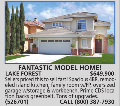 FANTASTIC MODEL HOME! LAKE FOREST $649,900 Sellers priced this to sell fast! Spacious 4BR, remodeled island kitchen, family room w/FP, oversized garage w/storage & workbench. Prime CDS location backs greenbelt. Tons of upgrades. (526701) CALL (800) 387-7930