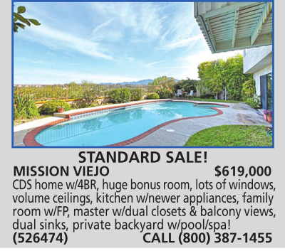 STANDARD SALE! MISSION VIEJO $619,000 CDS home w/4BR, huge bonus room, lots of windows, volume ceilings, kitchen w/newer appliances, family room w/FP, master w/dual closets & balcony views, dual sinks, private backyard w/pool/spa! (526474) CALL (800) 387-1455