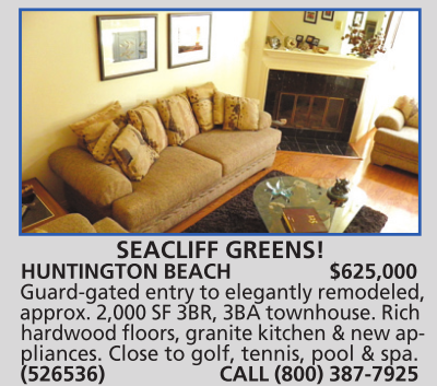 HUNTINGTON BEACH $625,000 Guard-gated entry to elegantly remodeled, approx. 2,000 SF 3BR, 3BA townhouse. Rich hardwood floors, granite kitchen & new appliances. Close to golf, tennis, pool & spa.