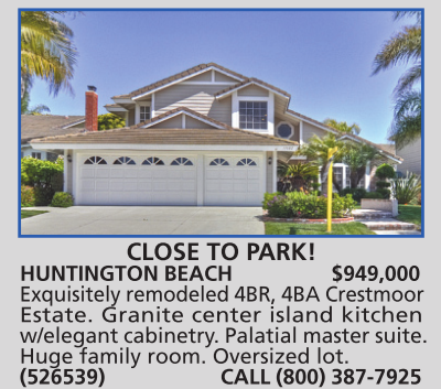 HUNTINGTON BEACH $949,000 Exquisitely remodeled 4BR, 4BA Crestmoor Estate. Granite center island kitchen w/elegant cabinetry. Palatial master suite. Huge family room. Oversized lot. (526539) CALL (800) 387-7925