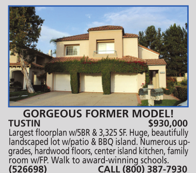 GORGEOUS FORMER MODEL! TUSTIN $930,000 Largest floorplan w/5BR & 3,325 SF. Huge, beautifully landscaped lot w/patio & BBQ island. Numerous upgrades, hardwood floors, center island kitchen, family room w/FP. Walk to award-winning schools. (526698) CALL (800) 387-7930