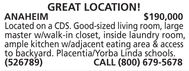 ample kitchen w/adjacent eating area & access to backyard. Placentia/Yorba Linda schools. (526789) CALL (800) 679-5678