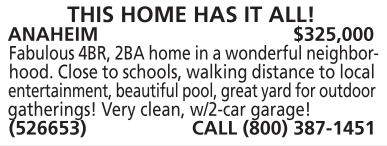 THIS HOME HAS IT ALL! ANAHEIM $325,000 Fabulous 4BR, 2BA home in a wonderful neighborhood. Close to schools, walking distance to local entertainment, beautiful pool, great yard for outdoor gatherings! Very clean, w/2-car garage! (526653) CALL (800) 387-1451