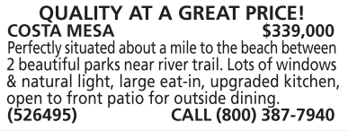 QUALITY AT A GREAT PRICE! COSTA MESA $339,000 Perfectly situated about a mile to the beach between 2 beautiful parks near river trail. Lots of windows & natural light, large eat-in, upgraded kitchen, open to front patio for outside dining. (526495) CALL (800) 387-7940