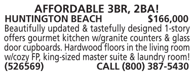 HUNTINGTON BEACH $166,000 Beautifully updated & tastefully designed 1-story offers gourmet kitchen w/granite counters & glass door cupboards. Hardwood floors in the living room w/cozy FP, king-sized master suite & laundry room! (526569) CALL (800) 387-5430