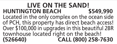 HUNTINGTON BEACH $549,990 Located in the only complex on the ocean side of PCH, this property has direct beach access! Over $100,000 in upgrades in this beautiful 2BR townhouse located right on the beach! (526640) CALL (800) 258-7630