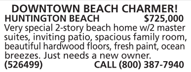 HUNTINGTON BEACH $725,000 Very special 2-story beach home w/2 master suites, inviting patio, spacious family room, beautiful hardwood floors, fresh paint, ocean breezes. Just needs a new owner. (526499) CALL (800) 387-7940