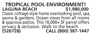 LAGUNA BEACH $1,980,000 Classic cottage-style home overlooking pool, spa, sauna & gardens. Ocean views from all rooms & spacious patios. This 10,000+ SF parcel offers privacy & seclusion. Walk to the beach. (526728) CALL (800) 387-1447