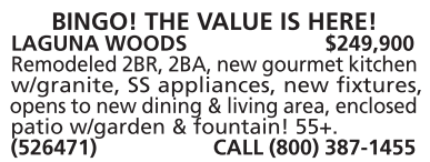 LAGUNA WOODS $249,900 Remodeled 2BR, 2BA, new gourmet kitchen w/granite, SS appliances, new fixtures, opens to new dining & living area, enclosed patio w/garden & fountain! 55+. (526471) CALL (800) 387-1455