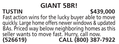 TUSTIN $439,000 Fast action wins for the lucky buyer able to move quickly. Large home offers newer windows & updated BAs. Priced way below neighboring homes as this seller wants to move fast. Hurry, call now. (526619) CALL (800) 387-7922