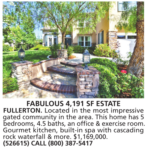 FABULOUS 4,191 SF ESTATE FULLERTON. Located in the most impressive gated community in the area. This home has 5 bedrooms, 4.5 baths, an office & exercise room. Gourmet kitchen, built-in spa with cascading rock waterfall & more. $1,169,000. (526615) CALL (800) 387-5417