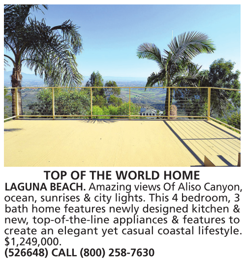 TOP OF THE WORLD HOME LAGUNA BEACH. Amazing views Of Aliso Canyon, ocean, sunrises & city lights. This 4 bedroom, 3 bath home features newly designed kitchen & new, top-of-the-line appliances & features to create an elegant yet casual coastal lifestyle. $1,249,000. (526648) CALL (800) 258-7630