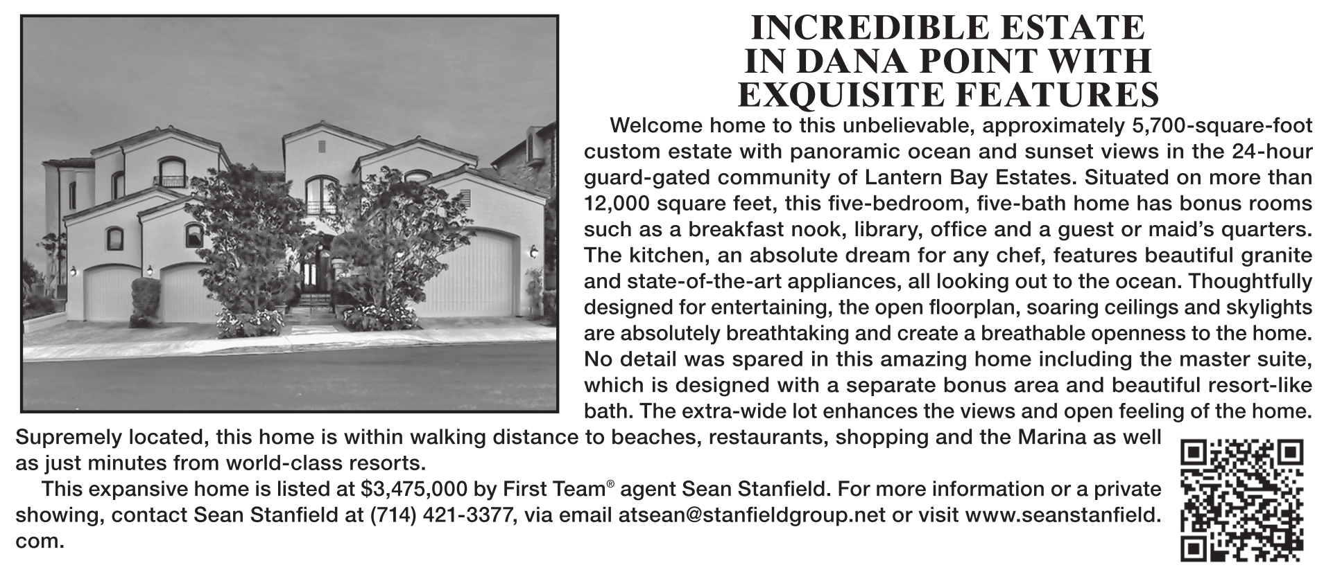INCREDIBLE ESTATE IN DANA POINT WITH EXQUISITE FEATURES Welcome home to this unbelievable, approximately 5,700-square-foot custom estate with panoramic ocean and sunset views in the 24-hour guard-gated community of Lantern Bay Estates. Situated on more than 12,000 square feet, this five-bedroom, five-bath home has bonus rooms such as a breakfast nook, library, office and a guest or maid’s quarters. The kitchen, an absolute dream for any chef, features beautiful granite and state-of-the-art appliances, all looking out to the ocean. Thoughtfully designed for entertaining, the open floorplan, soaring ceilings and skylights are absolutely breathtaking and create a breathable openness to the home. No detail was spared in this amazing home including the master suite, which is designed with a separate bonus area and beautiful resort-like bath. The extra-wide lot enhances the views and open feeling of the home. Supremely located, this home is within walking distance to beaches, restaurants, shopping and the Marina as well as just minutes from world-class resorts. This expansive home is listed at $3,475,000 by First Team ® agent Sean Stanfield. For more information or a private showing, contact Sean Stanfield at (714) 421-3377, via email atsean@stanfieldgroup.net or visit www.seanstanfield. com.