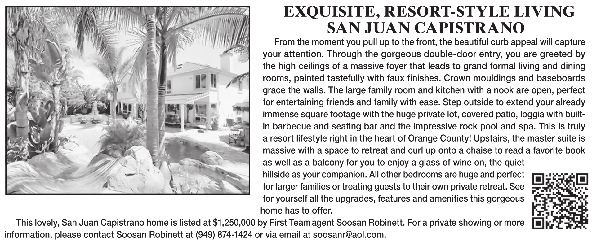 EXQUISITE, RESORT-STYLE LIVING SAN JUAN CAPISTRANO From the moment you pull up to the front, the beautiful curb appeal will capture your attention. Through the gorgeous double-door entry, you are greeted by the high ceilings of a massive foyer that leads to grand formal living and dining rooms, painted tastefully with faux finishes. Crown mouldings and baseboards grace the walls. The large family room and kitchen with a nook are open, perfect for entertaining friends and family with ease. Step outside to extend your already immense square footage with the huge private lot, covered patio, loggia with builtin barbecue and seating bar and the impressive rock pool and spa. This is truly a resort lifestyle right in the heart of Orange County! Upstairs, the master suite is massive with a space to retreat and curl up onto a chaise to read a favorite book as well as a balcony for you to enjoy a glass of wine on, the quiet hillside as your companion. All other bedrooms are huge and perfect for larger families or treating guests to their own private retreat. See for yourself all the upgrades, features and amenities this gorgeous home has to offer. This lovely, San Juan Capistrano home is listed at $1,250,000 by First Teamagent Soosan Robinett. For a private showing or more information, please contact Soosan Robinett at (949) 874-1424 or via email at soosanr@aol.com.