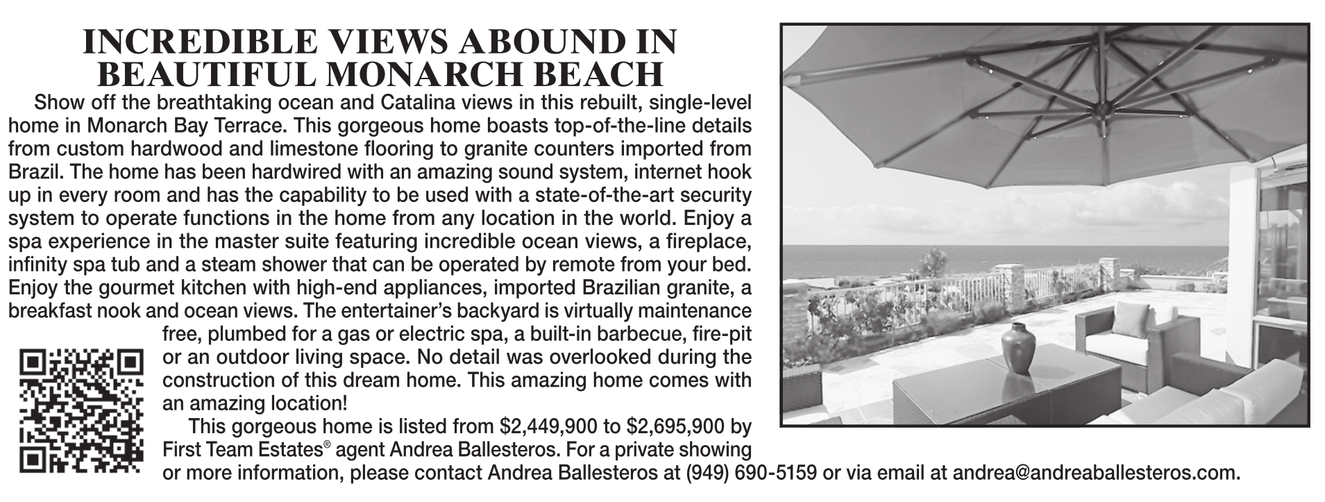 INCREDIBLE VIEWS ABOUND IN BEAUTIFUL MONARCH BEACH Show off the breathtaking ocean and Catalina views in this rebuilt, single-level home in Monarch Bay Terrace. This gorgeous home boasts top-of-the-line details from custom hardwood and limestone flooring to granite counters imported from Brazil. The home has been hardwired with an amazing sound system, internet hook up in every room and has the capability to be used with a state-of-the-art security system to operate functions in the home from any location in the world. Enjoy a spa experience in the master suite featuring incredible ocean views, a fireplace, infinity spa tub and a steam shower that can be operated by remote from your bed. Enjoy the gourmet kitchen with high-end appliances, imported Brazilian granite, a breakfast nook and ocean views. The entertainer’s backyard is virtually maintenance free, plumbed for a gas or electric spa, a built-in barbecue, fire-pit or an outdoor living space. No detail was overlooked during the construction of this dream home. This amazing home comes with an amazing location! This gorgeous home is listed from $2,449,900 to $2,695,900 by First Team Estates ® agent Andrea Ballesteros. For a private showing or more information, please contact Andrea Ballesteros at (949) 690-5159 or via email at andrea@andreaballesteros.com.