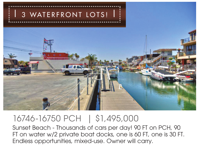 Sunset Beach - Thousands of cars per day! 90 FT on PCH, 90 FT on water w/2 private boat docks, one is 60 FT, one is 30 FT. Endless opportunities, mixed-use. Owner will carry.