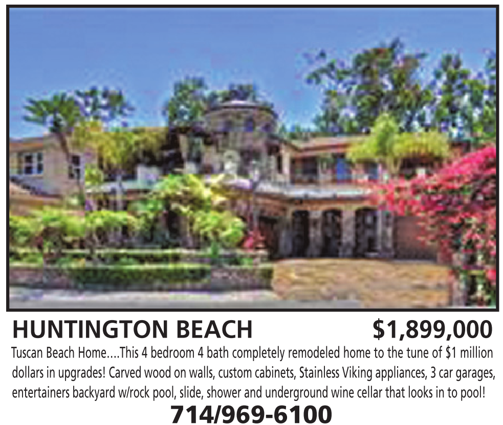 HUNTINGTON BEACH $1,899,000 Tuscan Beach Home….This 4 bedroom 4 bath completely remodeled home to the tune of $1 million dollars in upgrades! Carved wood on walls, custom cabinets, Stainless Viking appliances, 3 car garages, entertainers backyard w/rock pool, slide, shower and underground wine cellar that looks in to pool! 714/969-6100