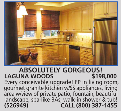 LAGUNA WOODS $198,000 Every conceivable upgrade! FP in living room, gourmet granite kitchen w/SS appliances, living area w/view of private patio, fountain, beautiful landscape, spa-like BAs, walk-in shower & tub! (526949) CALL (800) 387-1455