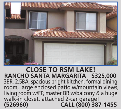 RANCHO SANTA MARGARITA $325,000 3BR, 2.5BA, spacious bright kitchen, formal dining room, large enclosed patio w/mountain views, living room w/FP, master BR w/balcony & a huge walk-in closet, attached 2-car garage! (526960) CALL (800) 387-1455