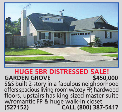 GARDEN GROVE $450,000 S&S built 2-story in a fabulous neighborhood offers spacious living room w/cozy FP, hardwood floors, upstairs has king-sized master suite w/romantic FP & huge walk-in closet. (527152) CALL (800) 387-5417
