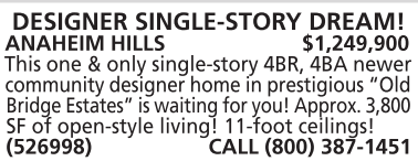 ANAHEIM HILLS $1,249,900 This one & only single-story 4BR, 4BA newer community designer home in prestigious “Old Bridge Estates” is waiting for you! Approx. 3,800 SF of open-style living! 11-foot ceilings! (526998) CALL (800) 387-1451