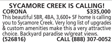 CORONA $335,000 This beautiful 5BR, 4BA, 3,600+ SF home is calling you to Sycamore Creek. Very long list of upgrades & custom amenities make this a very attractive choice. Backyard paradise w/great views.