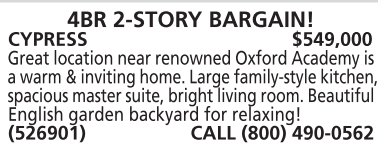 4BR 2-STORY BARGAIN! CYPRESS $549,000 Great location near renowned Oxford Academy is a warm & inviting home. Large family-style kitchen, spacious master suite, bright living room. Beautiful English garden backyard for relaxing! (526901) CALL (800) 490-0562